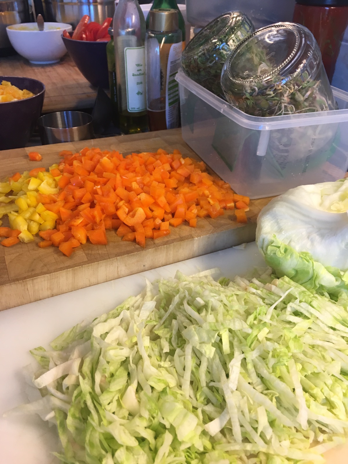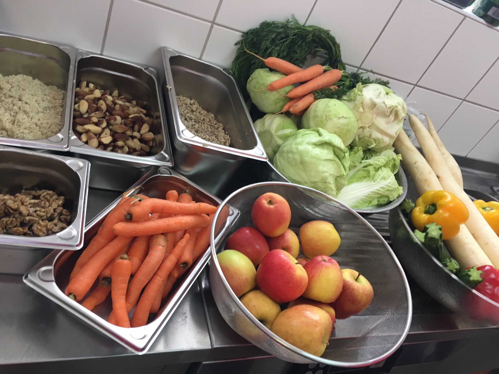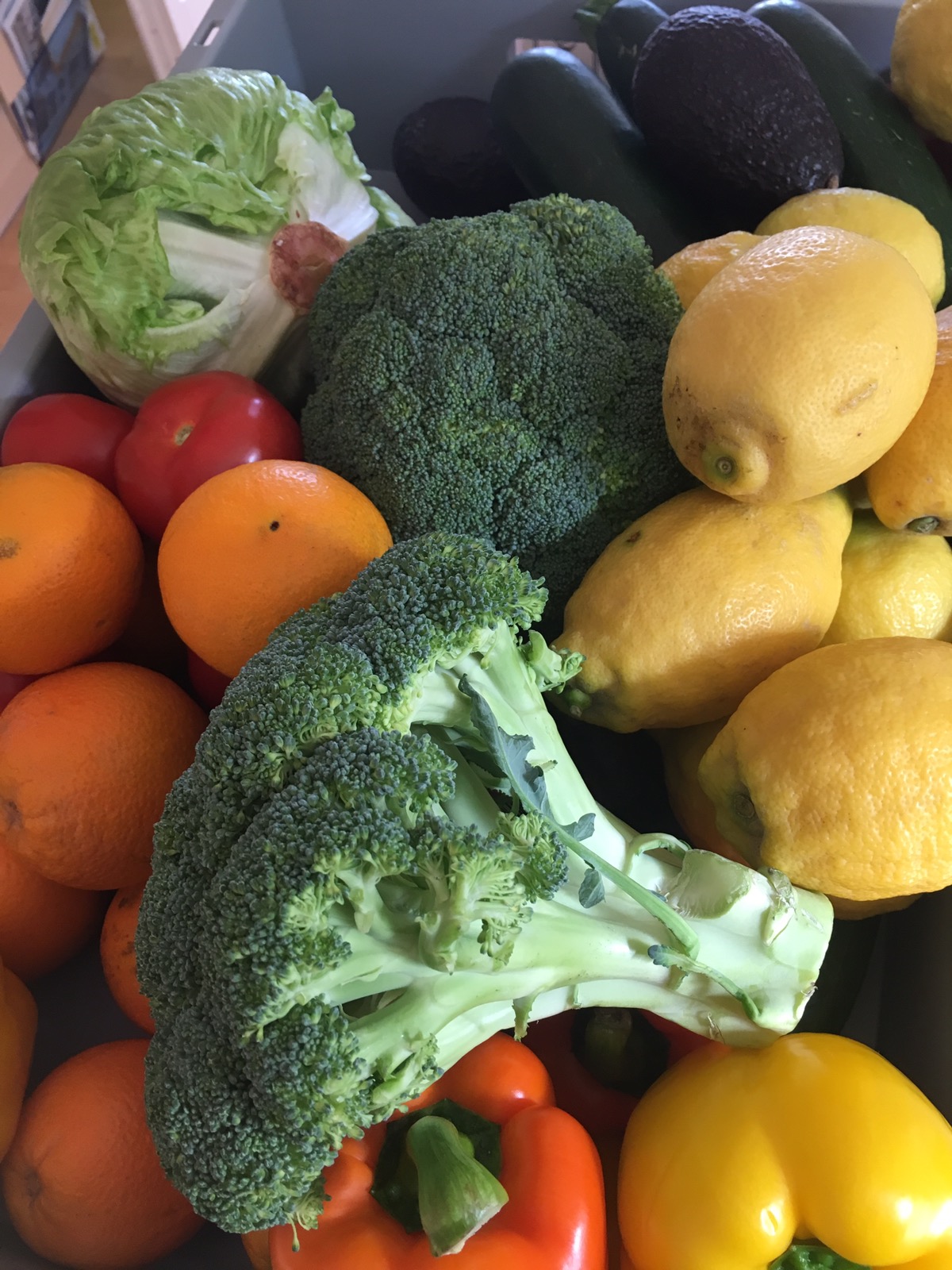 10 gelbe Paprika / 2 Gurken / 2 rote Paprika / 32 Avocado/ 2 Kg Blumenkohl/ 2 Kg Brokkoli / 10 Zitronen / 2 Eisbergsalate / 10 Zucchini / 10 große Tomaten / 12 Orangen, sowie Kräuter und Spinat und Himbeeren werden noch frisch gekauft.