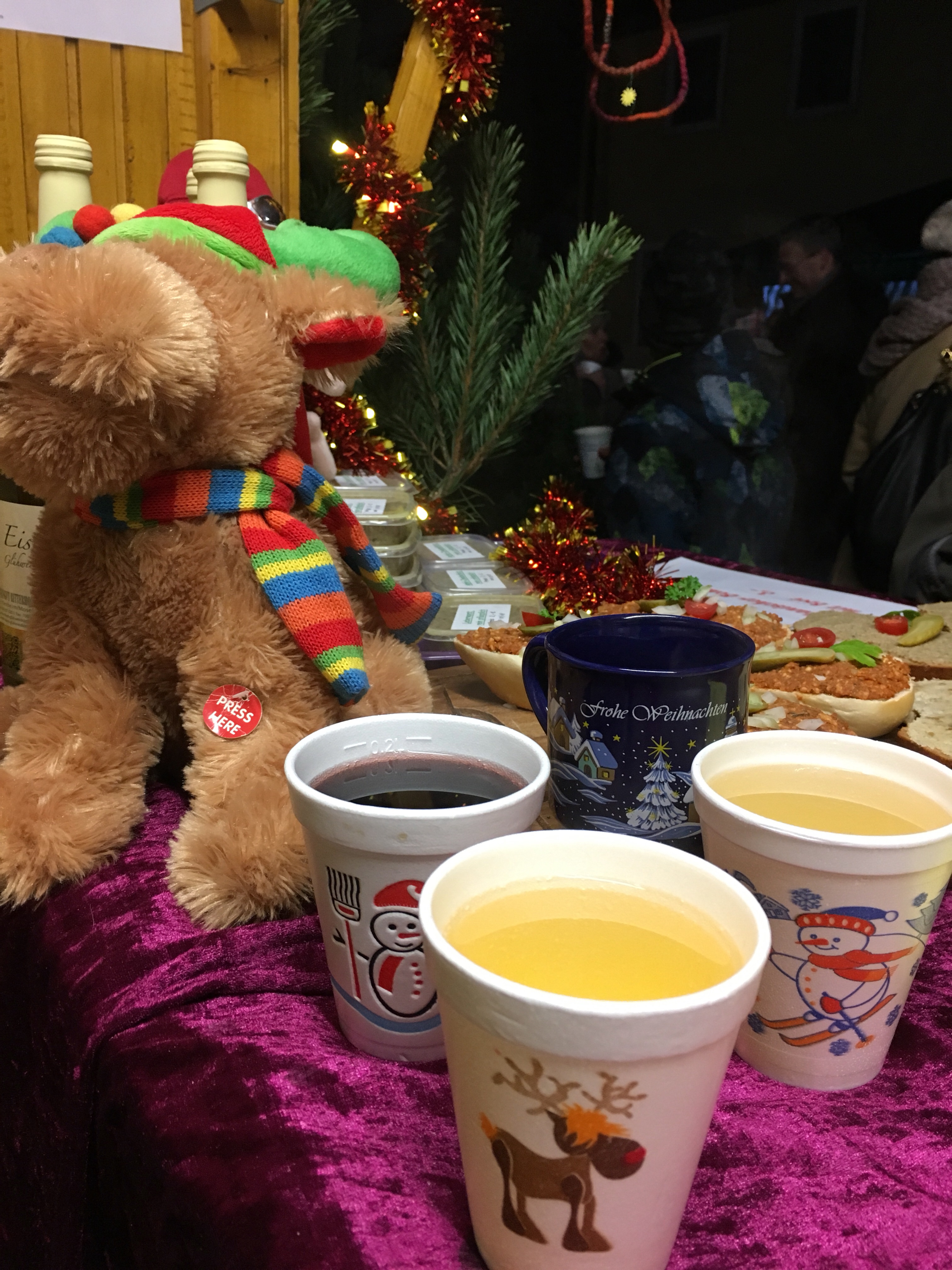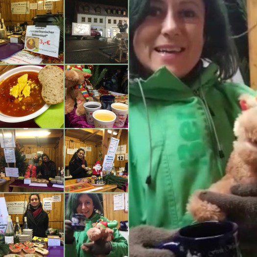 So, heute haben wir unseren ersten Weihnachtsmarkt. Es gibt wie immer unseren beliebten Weißen Glühwein von der Mosel, gefolgt von Roten und Weinschokolade. Fruchtpunsch, Heiße Holunderblüte, Ingwer-Zitronenpunsch und lecker Vegane Fettschnitten, Vegane Leberwurstbrote, Vegane Mettbrötchen und das erste Mal einen Südamerikanischen Bohnentopf, heiß und feurig.