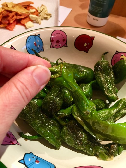 Bei mir gab es heute Mittag mal keine Rohkost. Nach einem großen Smoothie aus frischen Feldsalat ( regional) Apfel, Orange, Brennnessel und viel Ingwer habe ich mir Pimientos de Patrón gemacht. So ein bisschen weil’s ja bald nach Spanien geht… Ich liebe diese kleinen gebratenen Schoten, lustig, gebraten in Olivenöl von Griechenland ( roh)… grobes Meersalz aus Portugal und zum Glück wenigstens die Schoten aus Spanien.!!!