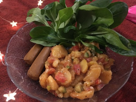 und dann noch traditionell: Kartoffelsalat mit Würstchen und Feldsalat, natürlich vegan. Noch von zu Hause mitgebracht, ging es uns richtig gut.