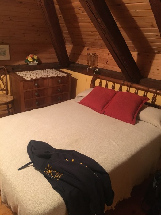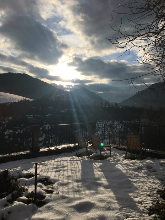 Jetzt habe ich mir bisschen Zeit auf meinem Zimmer gegönnt… ist auch nicht unbedingt leicht, wenn man sonst ständig in Bewegung ist. Aber Spaziergang ist so nicht möglich, die Wege im Ort sind alle sehr steil und voll total nassen Schnee, es ist sooooo glatt. Also besser mal was ausruhen und einfach gerade dankbar sein, dass alles bis hier her so super geklappt hat und ich auch das noch garnicht so richtig fassen kann… 900 km zu Fuß durch Spanien und mal eben so 1900 km mit den Auto. Boah, so etwas habe ich alles noch nicht gemacht… was für ein Jahr.