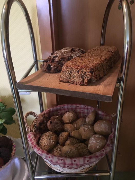 Glutenfreie Backwaren, Brötchen, Saatenbrot und süßes Osterbrot mit getrockneten Pfirsichen, Kirchen und Nüssen… hmmm!