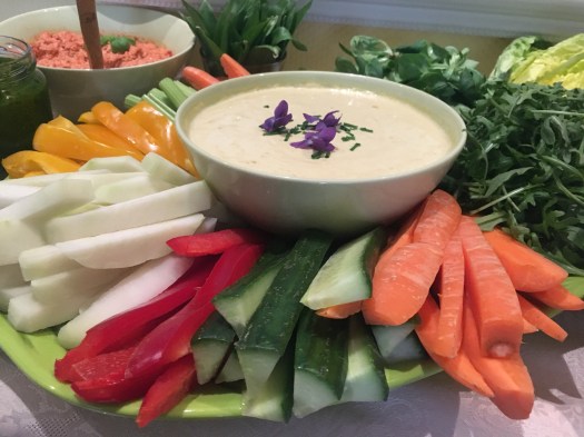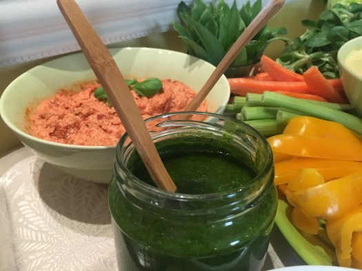 Gemüsesticks mit Roher Mayonnaise, Bärlauchpesto und fermentierter Cashewkäse mit Kräutern und Paprika