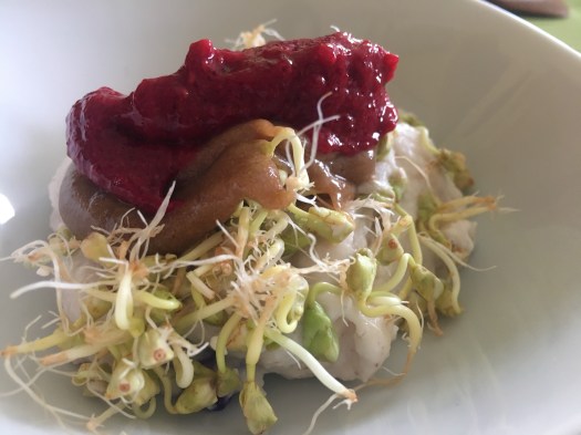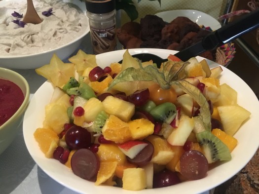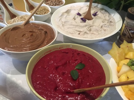 Sprossen, bunter Obstsalat und eine leckere süße Auswahl aus Dattelcaramel, Himbeermarmelade und Kokosjoghurt