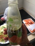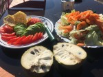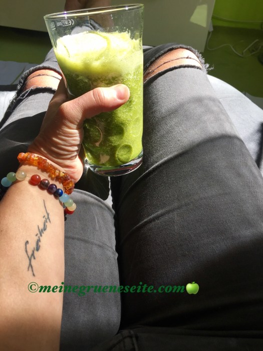 Bin dann in den Supermarkt und habe mir hier in der Küche einen leckeren Salat gemacht und noch eine Cherimoya musste mit und ein frischer Saft, an den habe ich mitgebrachtes grünes Wildgrünpulver gemacht.