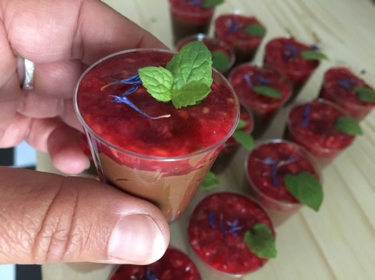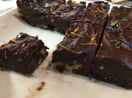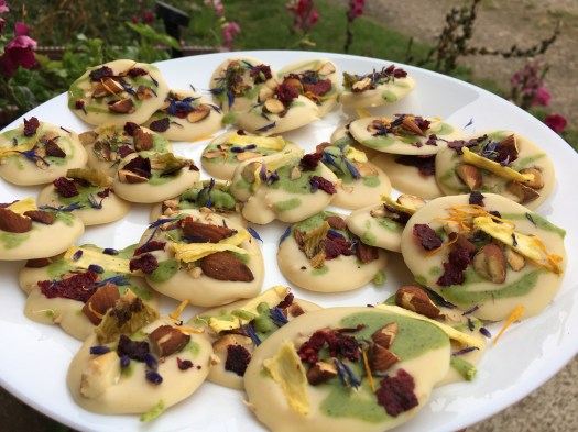 …und für die Kollegen zum Abschluss rohe weiße Schokoladentaler mit getrockneter Kiwi, Ananas, Himbeeren, Mandeln und Blütenblättern sowie Grüne Schokolade mit Chlorella und Kurkuma und Limettenöl.