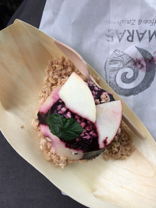 Zum Abschluss hab ich mir noch ein kleines Rohkost Törtchen, Apfel-Crumble-Blaubeer , mitgenommen. Die Auswahl war so groß, dass es schwer fiel.