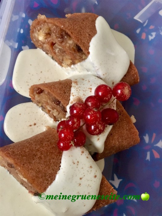 Karen hat dann noch ein letztes Mal Rohkost zubereitet…. Apfelstrudel mit Vanillesoße.