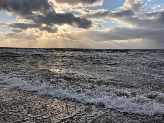 …im starken Wind lief ich am Wasser lang, das Wasser war im Vergleich zu den 16 Grad Außentemperatur richtig warm. Riesige Wellen…