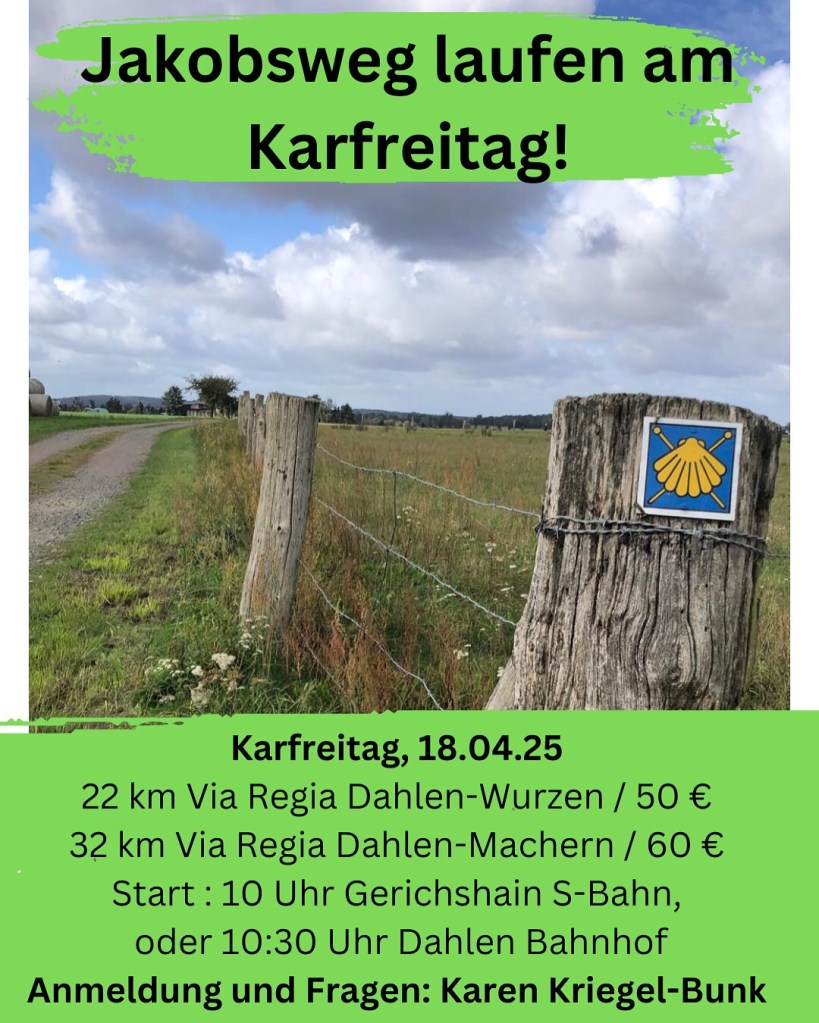 Ich begleite dich am 18.4.25 ein Stück auf der Via Regia. Wir starten morgens 10:30 Uhr in Dahlen und laufen 22 km bis Wurzen oder wenn du noch weiter magst 32 km bis Machern.