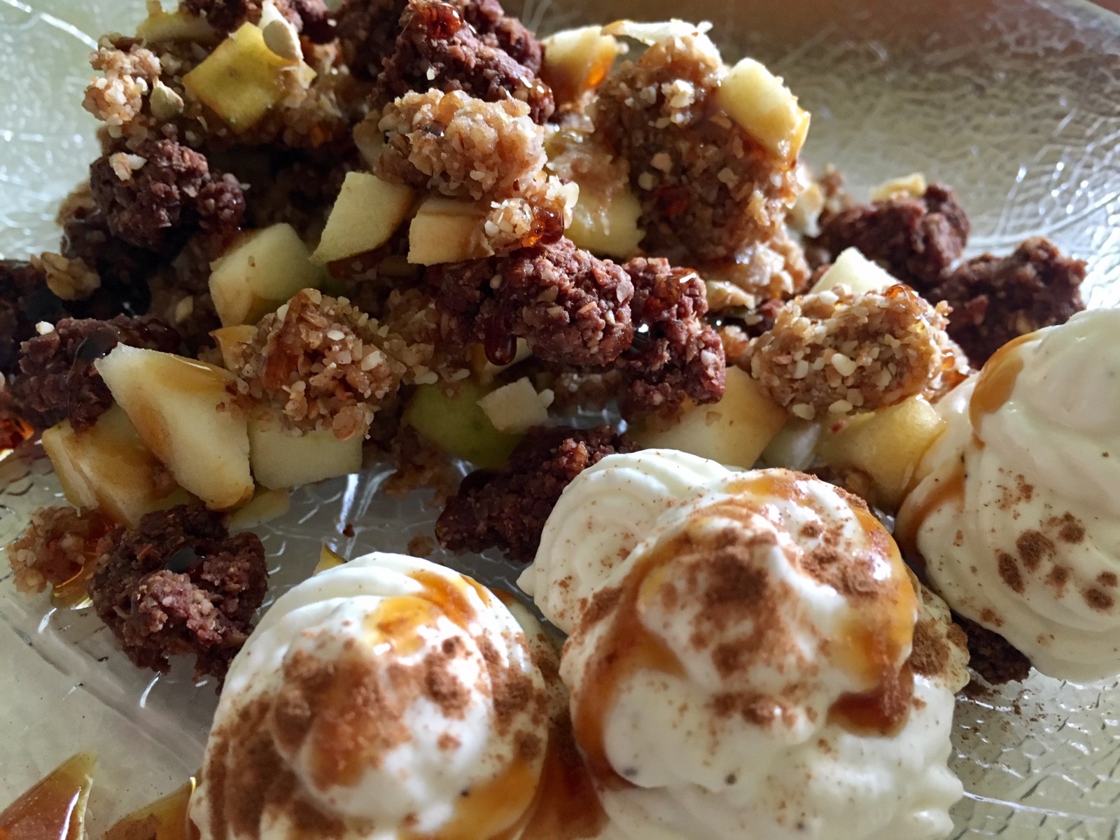 1 Apfel, 1 TL Zimt, 3 TL Rosinen, 2 TL Zitronensaft ( zur Soße mixen)
