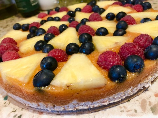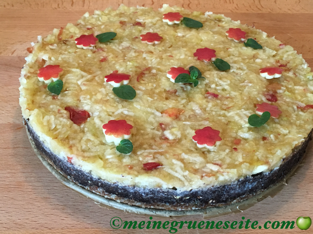 3-4 Apfel entkernen, raspeln und mit der Soße vermengen. 3 TL Flohsamenschalen unterrühren. Etwas ziehen lassen, ca.15-20 min. Danach die Masse auf dem Kuchen verteilen und kalt stellen.