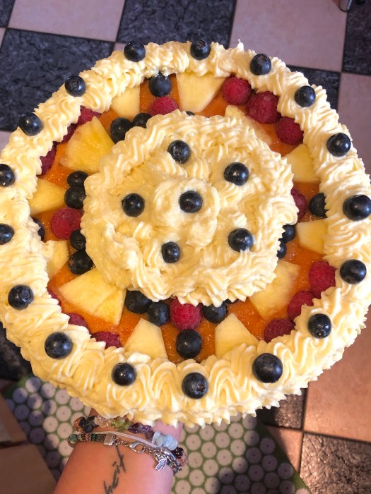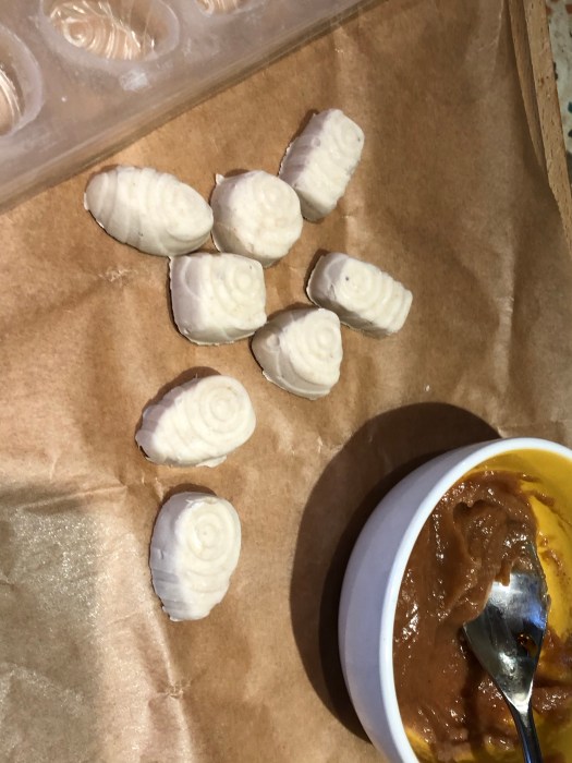 Die Kürbis-Kokossahne auf dem Kuchen verteilen, lässt sich super mit einem Spritzbeutel zu Sahnetuffs spritzen. Mit Schokolade dekorieren oder mit eingefärbten Kokosraspeln bestreuen. Im Kühlschrank eine Stunde ruhen lassen und dann auffuttern…