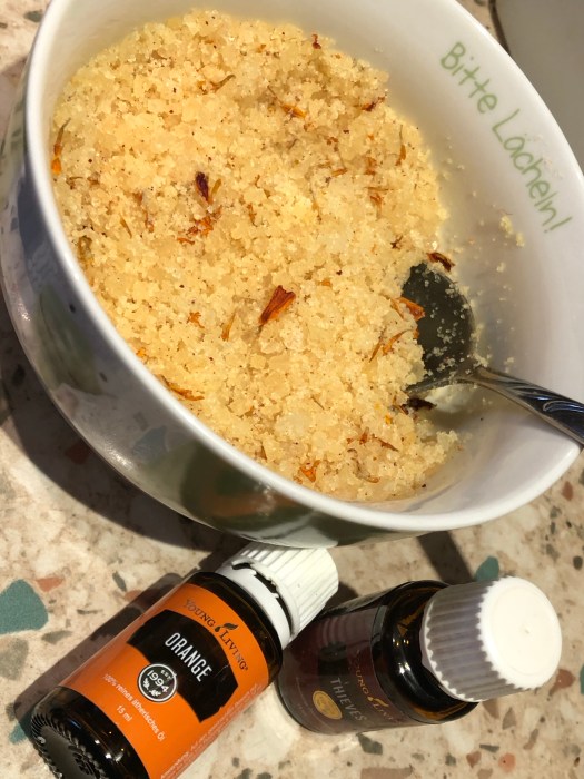 Zitrus– Thymian Salz: 1 EL getr. Thymian, 1/4 TL Kurkumapulver, 5 Tropfen Thymianöl, 5 Tropfen Limettenöl, 5 Tropfen Zitronenöl.