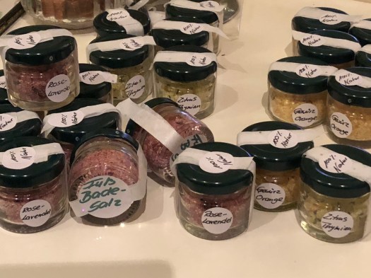 Lavendel–Rose Salz: Rosenblüten, 1/4 TL Rote Beete Pulver, 5 Tropfen Lavendelöl, 10 Tropfen Geraniumöl oder 8 Tropfen Rosenöl