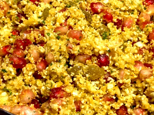 Blumenkohl und die Petersilie in der Küchenmaschine mit S-Messer zum feinen Reis hacken. Alles in eine Schüssel füllen. Alle weiteren Zutaten dazugeben und unterrühren. Mit Salz abschmecken und kurz ziehen lassen.