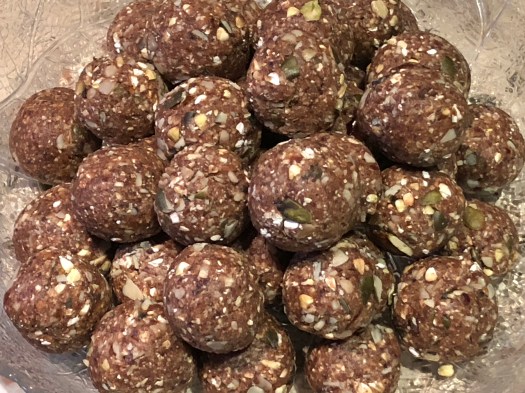Ich habe immer kleine Energiebällchen auf Vorrat. Für diese Woche habe ich Haselnusskugeln gemacht.