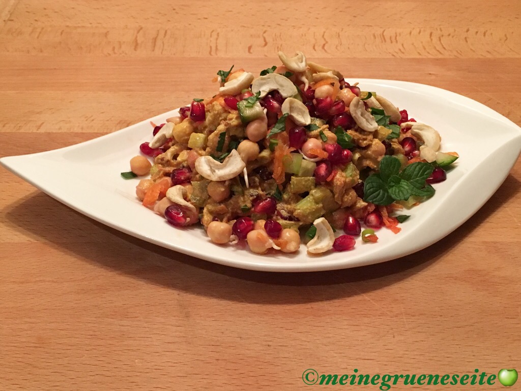 Salat mind. über Nacht ziehen lassen. Vor dem Servieren mit Cashewkernen dekorieren.